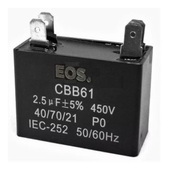 Capacitor 1MFD – 450V C/4 terminais EOS para refrigeradores. Capacitor permanente de trabalho para motores elétricos em ventiladores de teto, ventiladores de parede e exaustores.